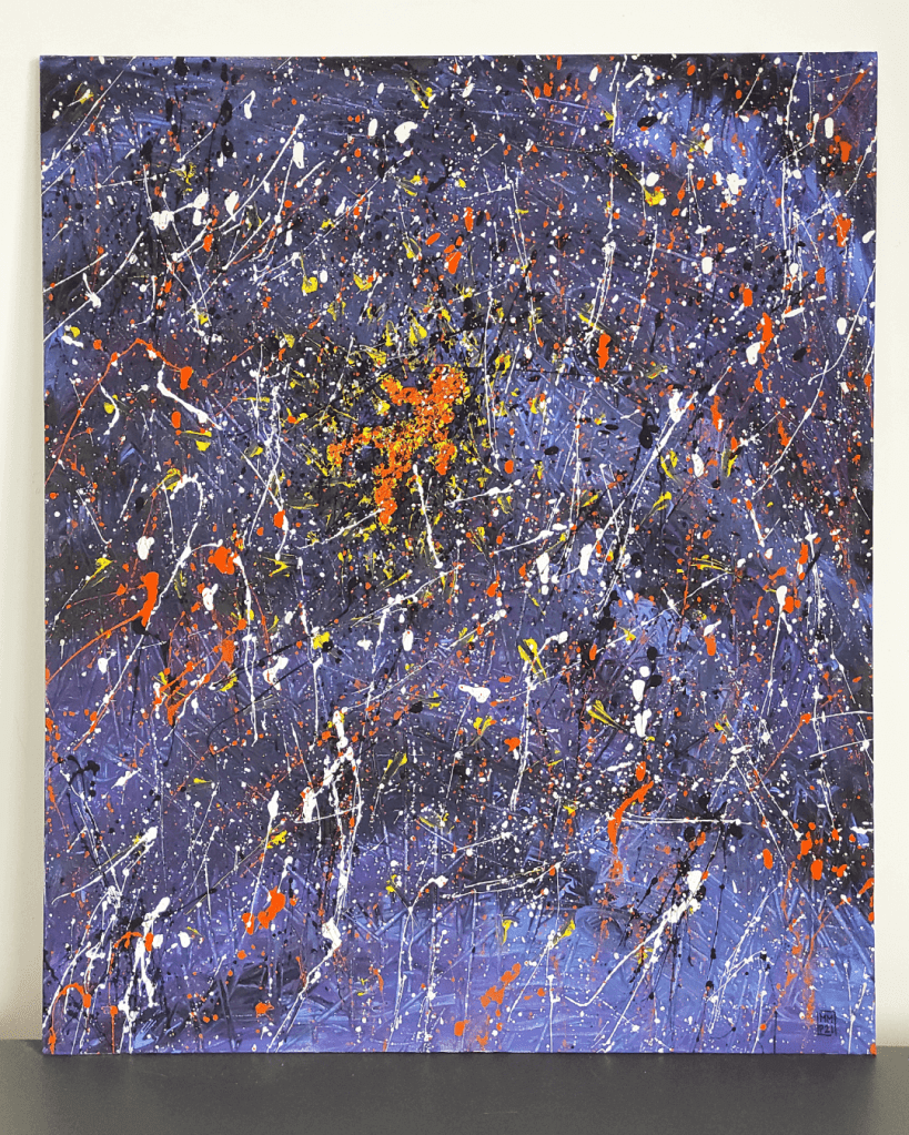 Perché siamo qui? Da dove veniamo? Chi siamo? Queste sono alcune delle domande esistenziali che l’uomo rivolge al cielo, di notte. L’oscurità dell’intimità con l’universo celeste, per assonanza, ci riconduce al buio del proprio personale universo interiore, il luogo in cui sono possibili le illuminazioni profonde. Nella notte generiamo speranze e dubbi, che si alimentano a vicenda, in un atto ricreativo e creativo continuo. Nel quadro, l’uomo è rappresentato in arancione, il colore del secondo chakra, che simboleggia l’incontro fecondo tra la triade mente-corpo-spirito, che caratterizza la propria interiorità, e il mondo esterno, in questo caso un cielo notturno. Il giallo, l’ego, nei rimuginii notturni esplode e si spande frammentato nello spazio infinito, come un cielo stellato. Osservando il cielo l’uomo osserva parti del sé, si interroga, si specchia, si riconosce e disconosce, si scarica di responsabilità troppo ingombranti e si carica di virtù che vorrebbe possedere. Il dipinto è stato eseguito intingendo la mano sinistra, pur essendo destrorsa, direttamente nel colore. Le forme nascono dalle sensazioni tattili, visive, uditive, olfattive. L’immagine non è costruita, nasce spontaneamente come libera espressione gestuale in risposta agli stimoli emotivi.