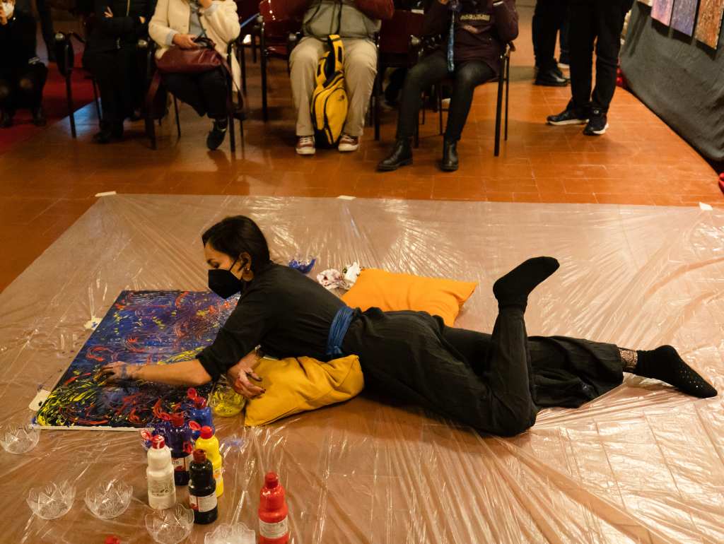 L’Architetto e Artista Maria Michaela Pani, durante la giornata di inaugurazione dell’evento Cosmogonie, il 4 dicembre 2021, si è anche esibita in una performance di live painting sotto gli occhi del pubblico incuriosito e catturato dai gesti veloci della performer. Il frutto della performance, di cui potete vedere di seguito alcuni scatti, è entrato a far parte del percorso espositivo, una volta concluso.